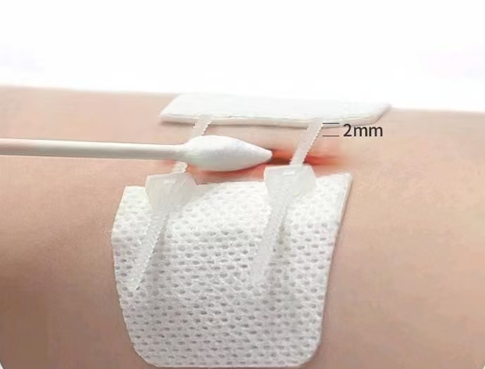 Working principle: The inward pulling force of the elastic bandage (tension reducer) forms a uniform counterforce with the outward tension on both sides of the wound, thereby achieving the purpose of non-invasive suture-free, tension-reducing and closing, and preventing the wound from widening.